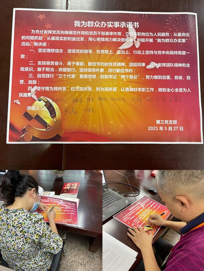 在活动现场,第三党支部全体党员在“我为群众办实事”承诺书上签名,让党员在工作中找准为群众办实事的发力点,在实际工作中践行承诺、兑现承诺,将纸上的承诺转化为办实事、解难事的生动实践。