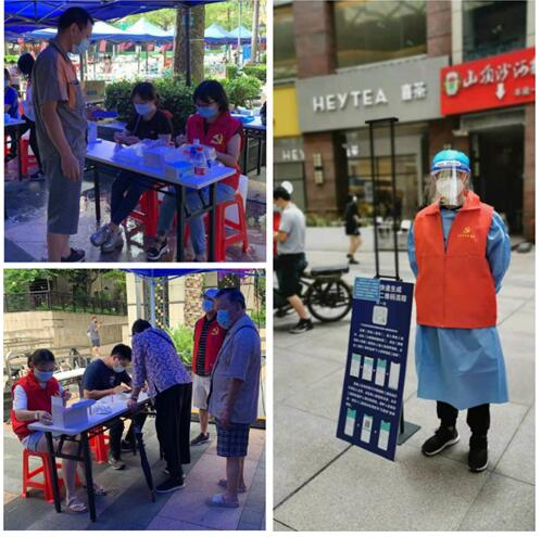 “请大家提前打开粤康码和葵花码,先量一下体温。”“请大家保持一米的距离,有序排队。小孩和老人请走绿色通道。”党员志愿者从早到晚忙碌着,即使声音沙哑、汗流浃背,但大家都毫无怨言,依旧斗志高昂、干劲十足,认真负责做好志愿服务工作,让党旗在防疫一线高高飘扬。不少群众看到佩戴党员徽章、穿着红马甲的党员志愿者,纷纷竖起大拇指。