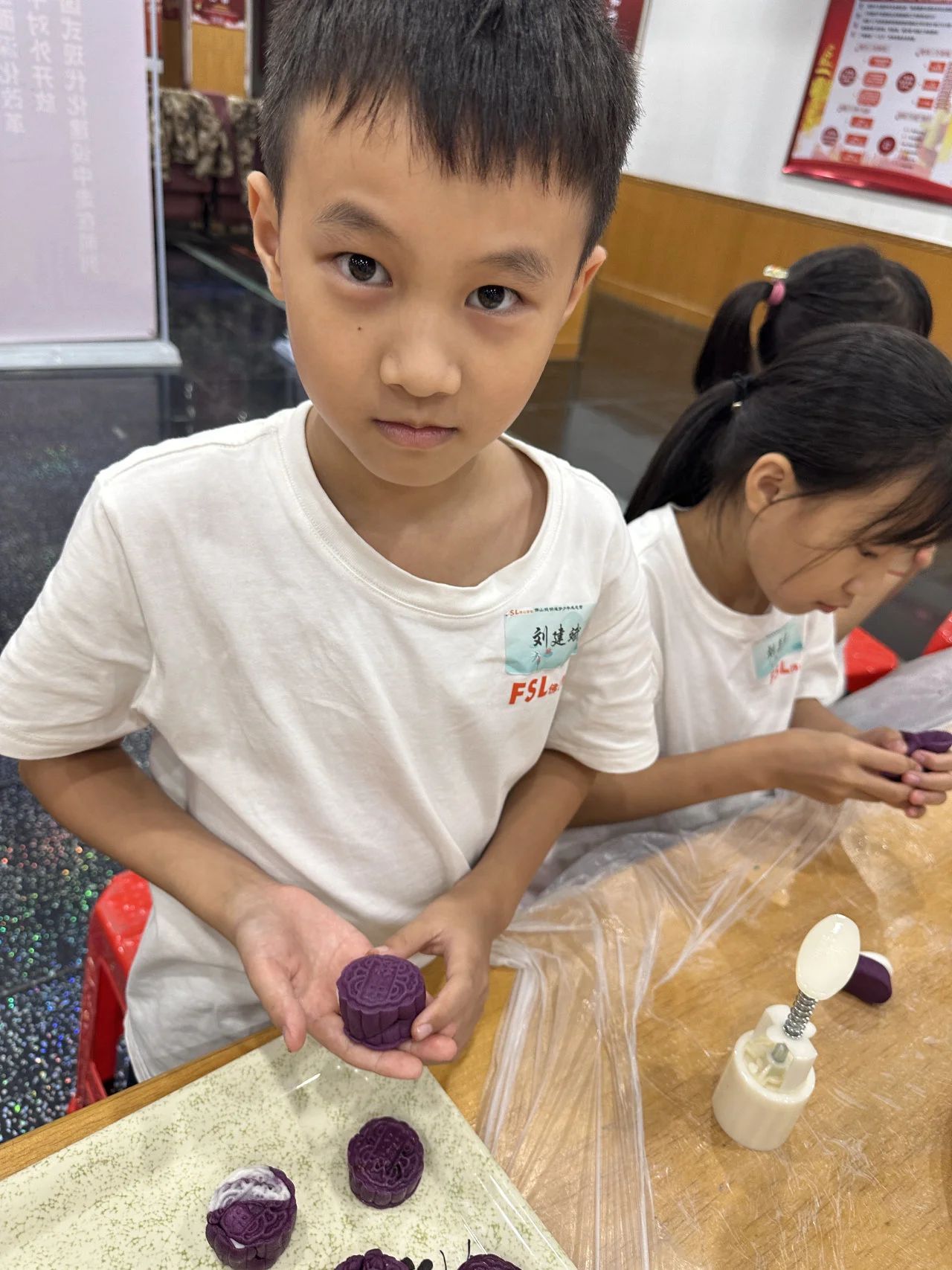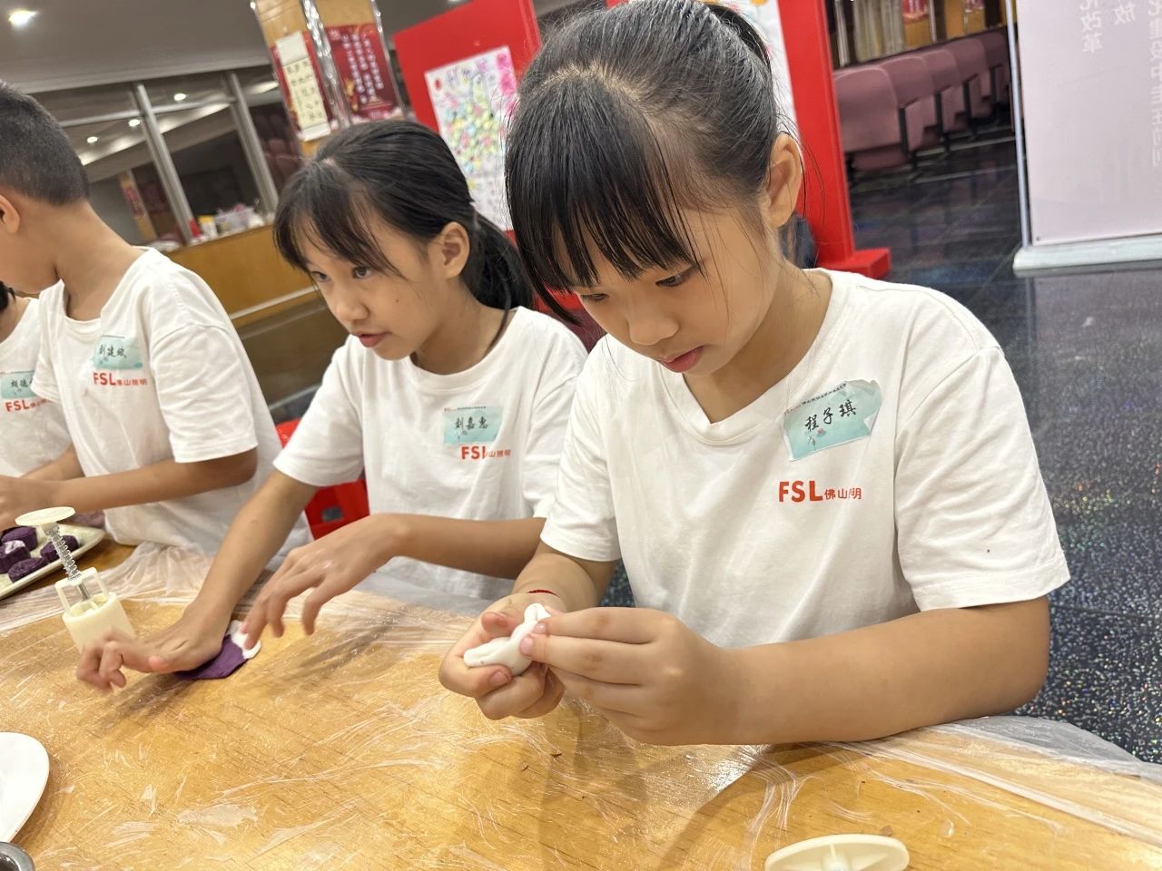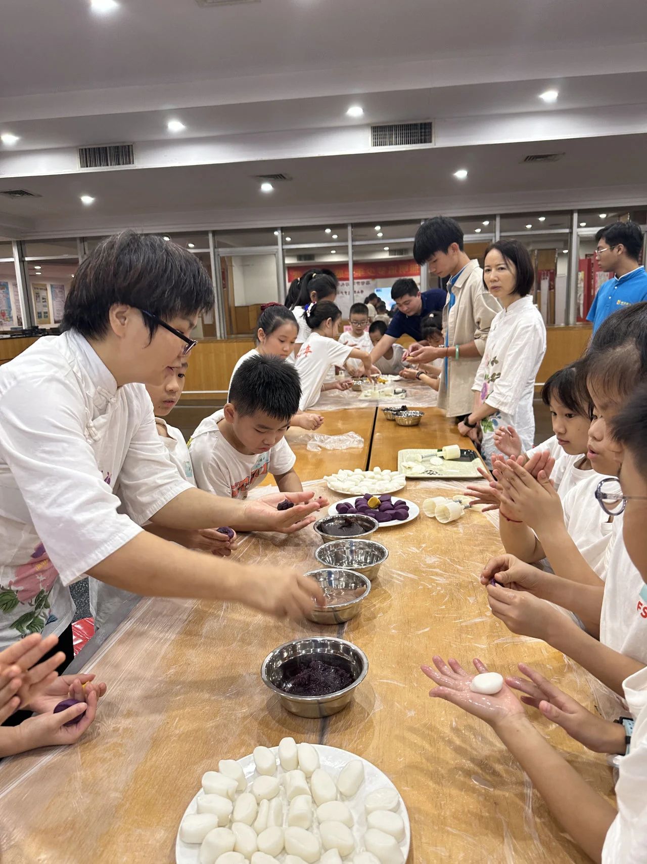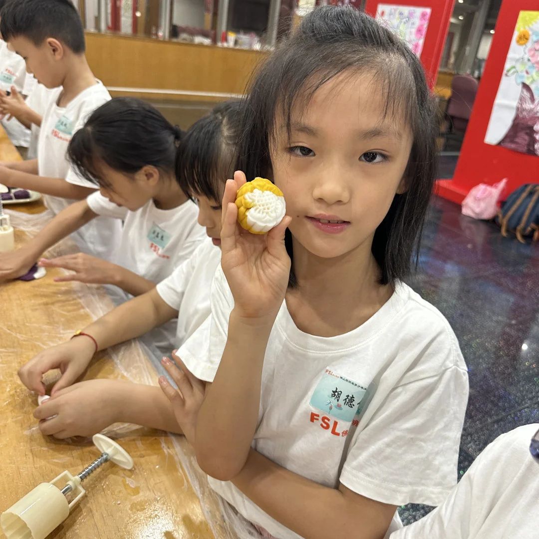 在老师的指导下,孩子们一起动手制作冰皮月饼。大家从准备饼皮、包馅料到按压成型的工艺流程中感受中华传统文化,并将亲手制作的月饼送给企业职工,在一声声的“谢谢”中感受分享给予的快乐,从实际行动中体验感恩。