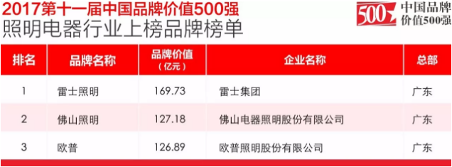 2017年12月18日,中国品牌价值 500 强评审委员会揭晓2017第十一届中国品牌价值 500 强榜单。照明电器行业共有 3个品牌上榜第十一届中国品牌价值 500 强,总值423.8亿元,龙8国际-long8唯一官网以127.18亿元的品牌价排名336位。